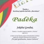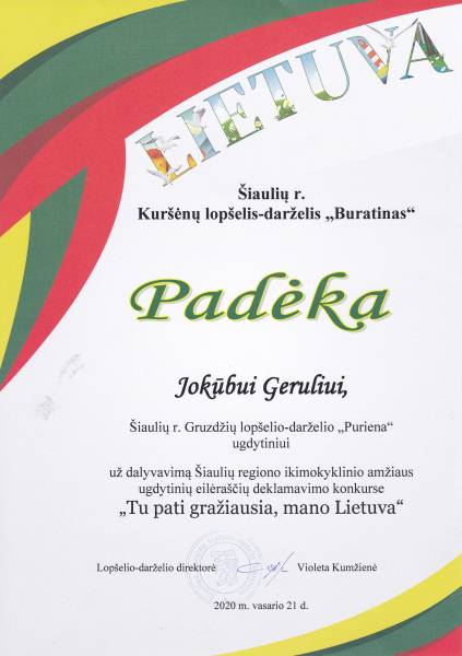 Vasario 21 d. „Ramuniukų“ grupės ugdytinis Jokūbas dalyvavo Šiaulių regiono ikimokyklinio amžiaus ugdytinių eilėraščių deklamavimo konkurse „Tu pati gražiausia, mano Lietuva“, vykusiame Šiaulių r. Kuršėnų lopšelyje-darželyje „Buratinas“. Berniukas auditorijai pristatė Balio Sruogos kūrybą, ištrauką iš poemos „Giesmė apie Gediminą“. Jokūbą paruošė vyresnioji auklėtoja Irmina Burneckienė. Lopšelio-darželio „Puriena“ skaitovas parsivežė iš renginio pakylėtą nuotaiką, padėką ir dovanų.