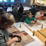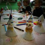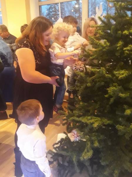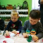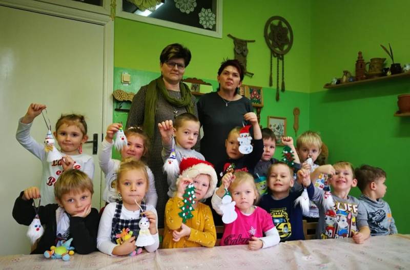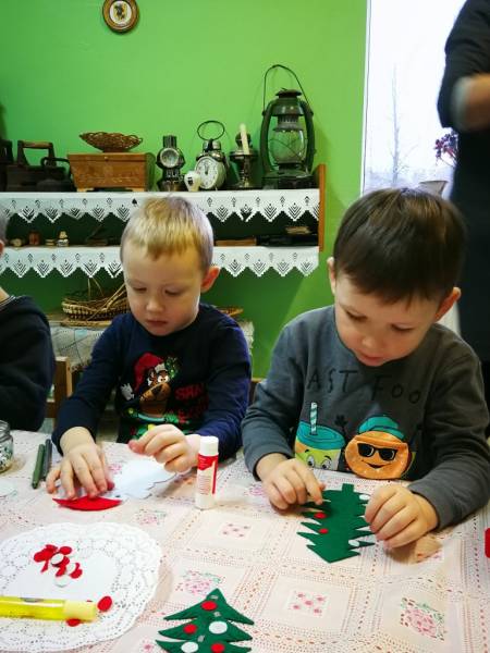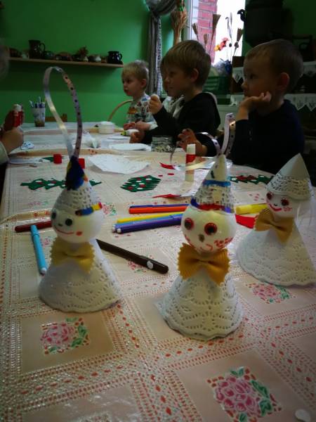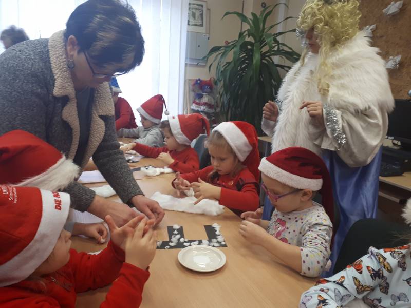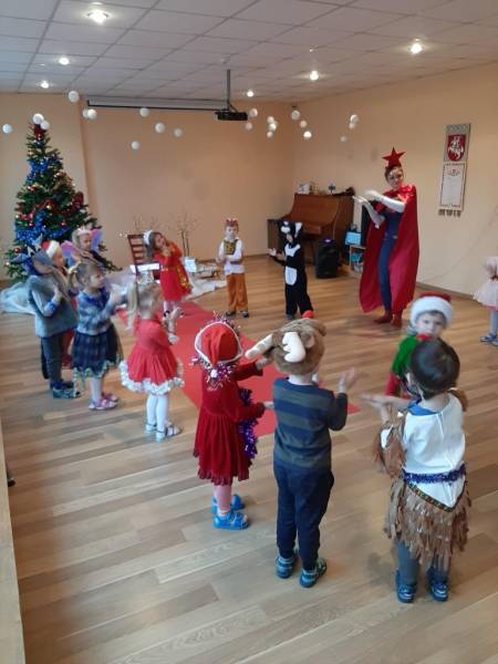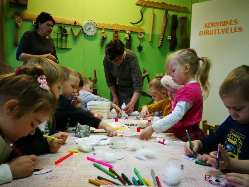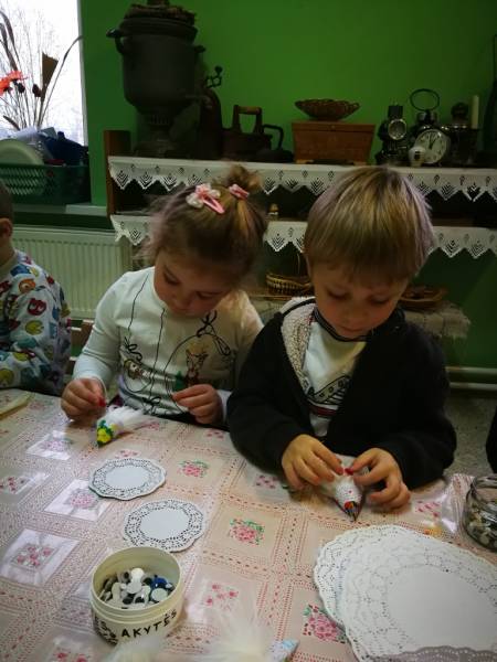 Gruodžio 10 d. popietę „Drugelių“ grupė kartu su auklėtoja Regina ir socialine partnere Liongina praleido kūrybinėse dirbtuvėlėse. Kartu su partnere atkeliavo ir jos draugai – begemotas ir drambliukas, kuriems vaikai suteikė vardus ir pavadino Otas ir Šiaurys. Visi nuėję į kūrybines dirbtuvėles ėmėsi darbo – pagaminti kalėdinį žaisliuką, kuriuo papuoš grupės eglutę. Liongina liepė išsirinkti, ką norės vaikai gaminti. Vieni pasirinko mergaites, kiti – eglutes, besmegenius ir nykštukus. Visi kibo į darbą: spalvino kepures, rinko ir klijavo akis, puošė eglutę, besmegenį. Grįžę į grupę, žaisliukus pakabino į eglutę ir socialinę partnerę pakvietė pažaisti „Pakulinį maišą“, „Graži mūsų šeimynėlė“. Vaikai laimingi džiaugėsi savo sukurtais žaisliukais, padėkojo Lionginai ir lauks kitų susitikimų.