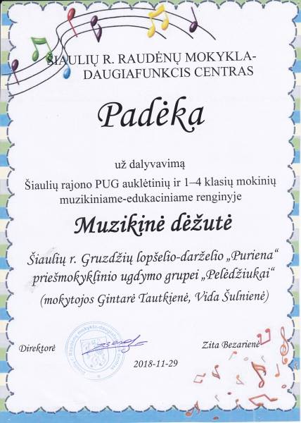 Lapkričio 29 dieną Šiaulių r. Raudėnų mokykloje-daugiafunkciniame centre vyko Šiaulių rajono priešmokyklinio ir pradinio ugdymo mokinių muzikinis–edukacinis renginys „Muzikinė dėžutė“. Į jį vyko ir mūsų lopšelio-darželio priešmokyklinės „Pelėdžiukų“ grupės 11 ugdytinių. Jie atliko D. Šostakovičiaus „Valsą“, pritariant instrumentais – varpeliais, trikampiais, metalofonais, tamburinais, žvangučiais, molinuku ir pasaką be galo „Du karaliai“ muz. E. Tolvaišienės, žodž. A. Matučio, pritariant kūno judesiais-caksėjimu, plojimu, trepsėjimu… Ugdytiniai taip pat įsitraukė į bendrą kūrybinę–improvizacinę edukaciją, gilino muzikos kalbos žinias bei asmeninį patyrimą kartu muzikuojant. Dalyviai buvo apdovanoti padėkos raštais ir saldžiomis dovanėlėmis. Pasisėmę gerų emocijų, nuotaikos, sceninės patirties, visi džiaugėmės šiltu pasibuvimu, Dėkojame atlikėjų mamytėms: Laurai, Rasai, Žydrūnei, Sivijai, tėveliui Aurimui už palaikymą, pagalbą renginio metu bei pavėžėjimą į Raudėnus! Išsiskirstėme visi patyrę gerų įspūdžių, nemažai pamatę ir sužinoję.