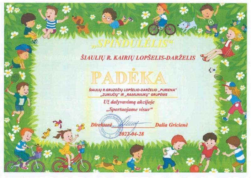 Balandžio mėnesį ,,Ramuniukų“ ir „Zuikučių“ grupių ugdytiniai dalyvavo respublikinėje ikimokyklinio ir priešmokyklinio amžiaus vaikų akcijoje „Sportuojame visur“. Kad nedingtų vaikų motyvacija aktyviai veiklai panaudotos ne tik įprastos, bet ir netradicinės sportui patalpos.