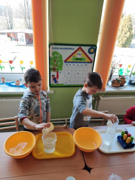 Kovo 21-25 d. „Ramuniukai“ tyrinėjo, aiškinosi, kiek svarbus vanduo mūsų kasdieniame gyvenime. Sužinojo, kad žmogaus organizmą sudaro septynios dalys vandens iš dešimties viso kūno masės. Kasdien atliko po įdomų eksperimentą su vandeniu. Kūrė „Lašelių muziką“ pasinaudodami informacinėmis technologijomis, kirpo popierinius, bet vandeny neskęstančius „drakoniukus“. Žaidė neįprastą „balų“ matematiką – dažytą vandenį pipetėmis lašino į lape pavaizduotus apskritimus ir skaičiavo, kiek reikia lašų užpildyti kiekvienai formai – „balutei“. Taikė atsipalaidavimo būdą taip pat vandens tema – patogiai įsitaisę klausėsi vandens muzikos garsų. Su visuomenės sveikatos specialiste vaikai atliko vandens talpų matavimo tyrimą. Vandens tema bus tęsiama įsitraukiant į Klaipėdos miesto lopšelių-darželių „Puriena“ ir „Pumpurėlis“ organizuojamus projektus.