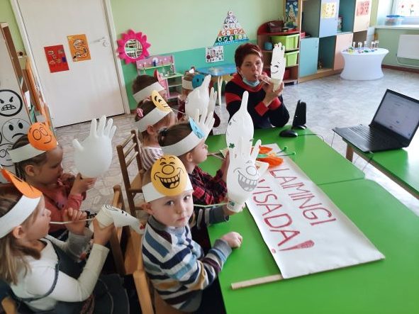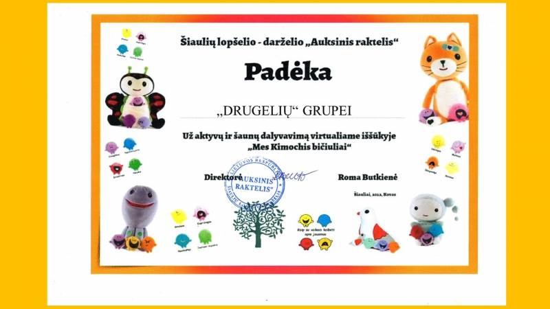 Kovo 30 d. „Drugelių“ grupės komanda, pasipuošusi įvairių emocijų atributais, dalyvavo Šiaulių regiono ikimokyklinio ir priešmokyklinio amžiaus vaikų virtualiame iššūkyje „Mes Kimochis bičiuliai“, kurį organizavo Šiaulių lopšelis-darželis „Auksinis raktelis“. Iššūkio tikslas – dalintis socialinių emocinių gebėjimų ugdymo bei programos „Kimochis“ įgyvendinimo gerąja patirtimi. Kiekviena komanda atliko pateiktus namų darbus, o susitikimo dieną virtualiai pristatė savo komandą ir šūkį. „Drugelių“ komandos šūkis – „Drugeliai laimingi visada!“. Vaikai bendravo tarpusavyje, atsakė į pateiktus klausimus, organizatoriai pasidžiaugė grupės Kimochis erdve, atliktais namų darbais. Baigiantis susitikimui visos komandos atliko pūtimo-atsipalaidavimo užduotėlę. Smagu pabendrauti su kitų darželių komandomis ir pasipildyti džiaugsmingomis ir linksmomis emocijomis!