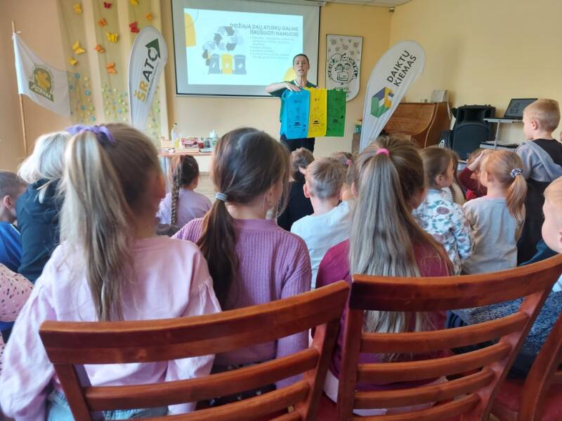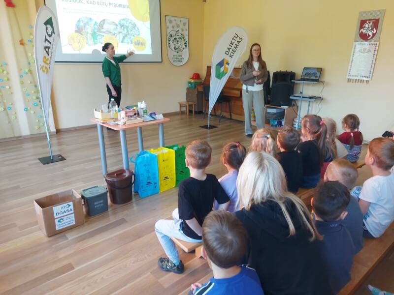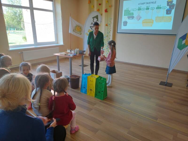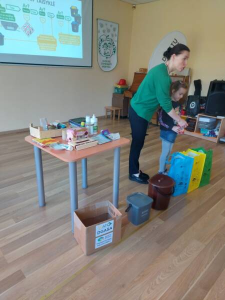 Gegužės mėnesį „Ramuniukų“ ir „Pelėdžiukų“ grupių ugdytiniai įgyvendino projekto „Mažieji gamtos saugotojai“ vieną iš veiklų – sudalyvavo edukacinėje valandėlėje „Mes – gamtos dalis“, kurį organizavo VŠĮ Šiaulių regiono atliekų tvarkymo centro viešųjų ryšių specialistė Rasa Gelžinytė ir „Daiktų kiemo“ veiklos priežiūros ir organizavimo vyr. specialistė Jurgita Udrienė. Projekto, kurio įgyvendinimą finansuoja Šiaulių rajono savivaldybės administracija, tikslas – ugdyti ikimokyklinio ir priešmokyklinio amžiaus vaikų ekologinę savimonę ir gamtamokslinę kompetenciją, formuojant aplinkai draugiškas vertybines nuostatas per edukacines, gamtamokslinio tyrinėjimo, kūrybines veiklas, taikant inovatyvius ugdymo bei STEAM metodus. Edukacinėje valandėlėje „Mes – gamtos dalis“, vaikai per patirtį įtvirtino žinias apie atliekų rūšiavimą, diskutavo ekologinėmis temomis, su edukatorėmis svarstė, kokios žmonių galimybės prisidedant prie gamtos saugojimo, tvarumo idėjų plėtojimo, dalintasi mintimis atsakant į klausimą, ar šiukšlės yra atliekos, pateikiant asmeninių patirčių. Interaktyviame pristatyme stebėti pavyzdžiai apie perdirbtus daiktus, aptarta, kokia grėsmė kyla gamtai dėl netinkamo žmonių tvarkymosi su šiukšlėmis. O asmeniniai rūšiavimo įgūdžiai pagilinti teisingai rūšiuojant. Pristatyta stotelių tinklo „Daiktų kiemas“ iniciatyva, skatinanti visuomenę nereikalingus, bet tinkamus naudoti daiktus pristatyti į specialius konteinerius, mažinant vartotojiškumą, skatinant atsakomybę. Priešmokyklinės „Pelėdžiukų“ grupės ugdytiniai, žinias apie rūšiavimą pasitikrino praėjus savaitei po edukacinės valandėlės ekskursijoje po Šiaulių miesto didelių gabaritų atliekų surinkimo aikštelę. Apžiūrėti įvairūs konteineriai, rūšiuojamos medžiagos, apsilankyta „Daiktų kieme“, išsiaiškinta, kokios yra pavojingos medžiagos, įsiminti ženklai, kuriais jos žymimos. Stebėtas konteinerių transportavimas perdirbimui. „Daiktų kiemo“ iniciatyva, visa lopšelio-darželio bendruomenė sudalyvavo tvarumo akcijoje „Tausojame gamtą“, renkant stiklainius prasmingam antriniam panaudojimui –„Maisto bankui“. Tvarumo idėjų plėtra per patirtį, praktinę veiklą, ugdytiniams stiprina gamtamokslinę kompetenciją, ekologinį sąmoningumą, pagarba aplinkai ir šalia esantiems!