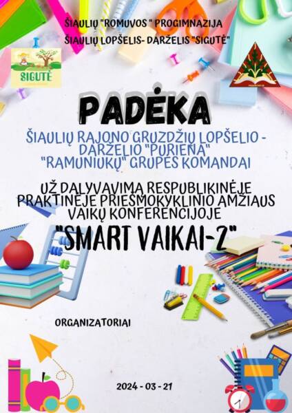 Kovo 21 d. „Ramuniukų“ grupės priešmokyklinukai Erman, Vesta ir Iglė dalyvavo respublikinėje praktinėje priešmokyklinio amžiaus vaikų konferencijoje „SMART VAIKAI-2“, kurią organizavo Šiaulių lopšelis-darželis „Sigutė“ ir Šiaulių Romuvos progimnazija. Konferencijos tikslas – pristatyti skaitmeninius įrankius, kuriuos naudoja vaikai įvairiose ugdymo(si) veiklose. Mūsų ugdytiniai pristatė pranešimą „„Ramuniukų“ grupės veiklos su bee-bot ir Qobo robotukais“. Vaikai konferencijos dalyviams pristatė, ko galima išmokti ir sužinoti, naudojantis robotukais. Vaikams tai nauja patirtis, tačiau labai naudinga: tai ir socialinių, pažintinių gebėjimų plėtotė bei galimybė ugdytis viešojo kalbėjimo įgūdžius.
