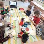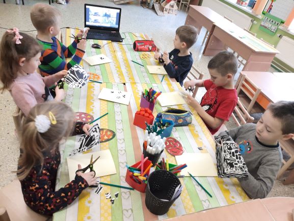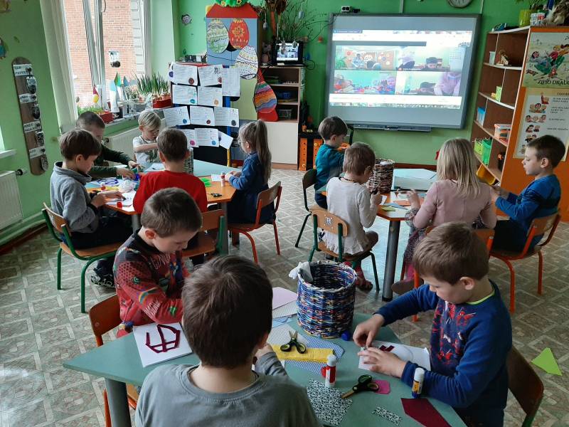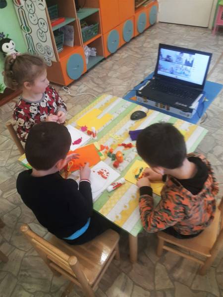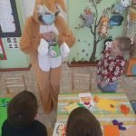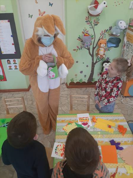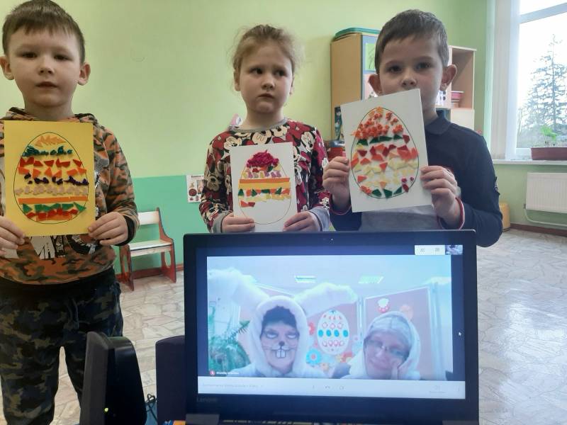 Balandžio 1 d. ryte „Drugelių“, „Ramuniukų“ ir „Pelėdžiukų“ grupių ugdytiniai smagiai praleido laiką nuotolinėje edukacijoje su socialiniais partneriais – Gruzdžių A. Griciaus bibliotekos darbuotojomis – Velykų bobute ir Velykų kiškiu. Personažai papasakoję savas istorijas, klausinėjo vaikų apie pasiruošimą Velykoms. Kiškis su bobute mokė vaikus daryti velykinį atviruką, kuriuo galėtų pradžiuginti savo artimuosius. Kaip smagu, kad gali kiškį sutikti ir gauti dovanų!